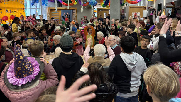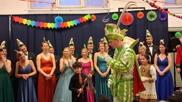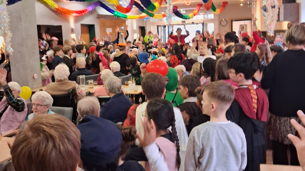 Ein ganz besonderer Höhepunkt ist der Besuch des Stadtprinzen Tobias I und der Prinzessin Jessica I mitsamt ihrem Gefolge, die mit viel Charme und guter Laune für strahlende Gesichter sorgen. Gemeinsam wird getanzt, gelacht und natürlich kräftig "Detten Helau!" gerufen. Für Begeisterung sorgt auch die Polonäse durch die Schule, bei der sich alle Klassen anschließen und gemeinsam tanzen. Ein besonders schöner Moment ist zudem die Polonäse durch den Kastanienhof. Mit Musik und fröhlicher Stimmung bringen wir Kaddis karnevalistische Freude zu den Bewohnerinnen und Bewohnern.